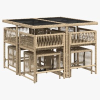 $523.58This garden dining set is a great choice for al fresco dining or just relaxing in the garden, backyard, or on the patio. Durable material: PE rattan, also known as poly rattan, is a strong, low-maintenance synthetic material that looks like natural rattan. It's lightweight, easy to clean, and commonly used for outdoor furniture due to its durability and weather-resistant properties.Compact storage: These chairs have a flap backrest that can be folded down, making it easy to store them under the table. When folded, they neatly fit under the table, forming a space-saving cube shape. Additionally, the stools can also be stored under the chairs, further maximizing space efficiency.Comfortable seat experience: This outdoor furniture, complete with thickly padded cushions, offers a comfortable seating experience.Removable and washable cover: These seat cushions feature removable covers for easy washing and maintenance. The cushion covers have a flap at the back for easy attachment to the backrests.Glass tabletop: The outdoor table's top is made from strong and durable tempered glass, making it easy to clean with a damp cloth and adding a touch of elegance to your outdoor space. Good to know:To make sure your outdoor furniture stays beautiful, we recommend protecting it with a waterproof cover.