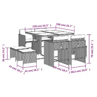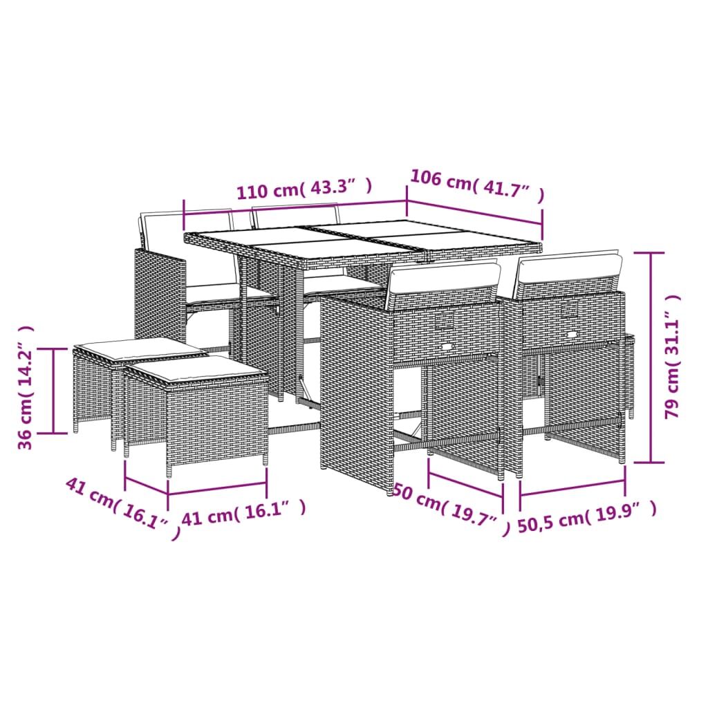 $511.49This garden dining set is a great choice for al fresco dining or just relaxing in the garden, backyard, or on the patio. Durable material: PE rattan, also known as poly rattan, is a strong, low-maintenance synthetic material that looks like natural rattan. It's lightweight, easy to clean, and commonly used for outdoor furniture due to its durability and weather-resistant properties.Compact storage: These chairs have a flap backrest that can be folded down, making it easy to store them under the table. When folded, they neatly fit under the table, forming a space-saving cube shape. Additionally, the stools can also be stored under the chairs, further maximizing space efficiency.Comfortable seat experience: This outdoor furniture, complete with thickly padded cushions, offers a comfortable seating experience.Removable and washable cover: These seat cushions feature removable covers for easy washing and maintenance. The chair cushion covers have a flap at the back for easy attachment to the chairs.Stable and easy-to-clean tabletop: This garden table has an acacia wood top that is sturdy, durable, and easy to clean with a damp cloth. Good to know: To make sure your outdoor furniture stays beautiful, we recommend protecting it with a waterproof cover.
