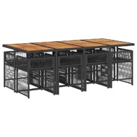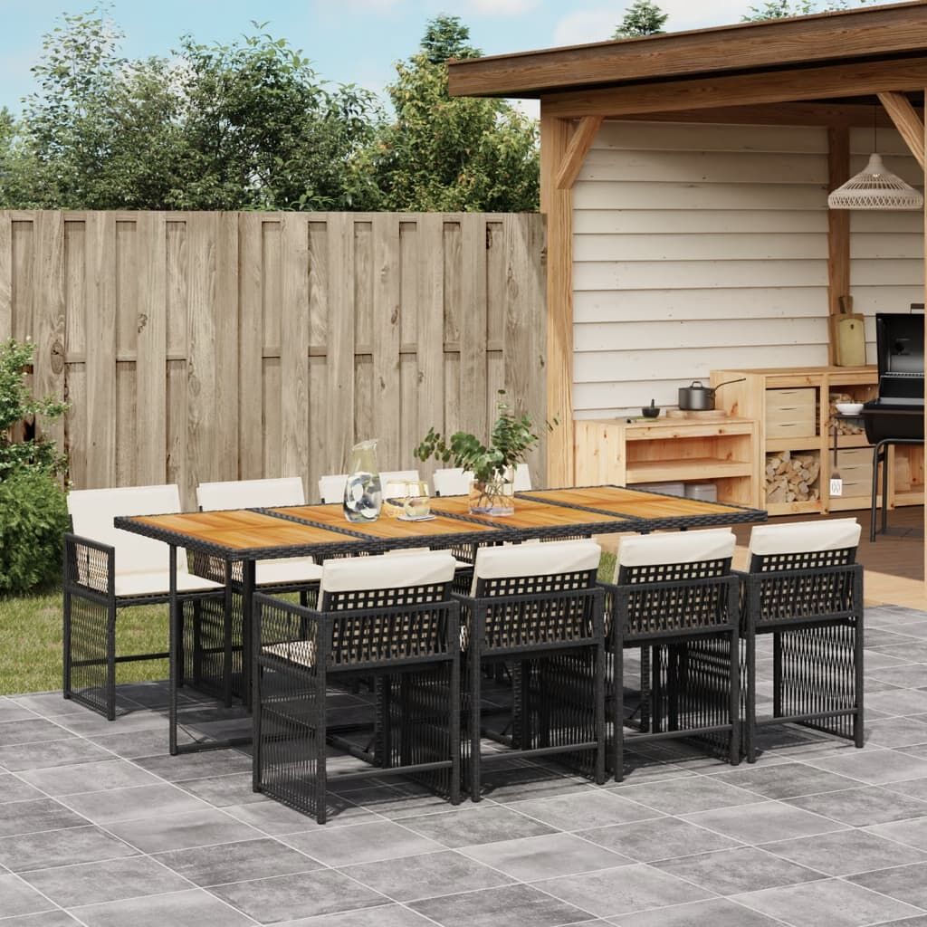$823.04This garden dining set is a great choice for al fresco dining or just relaxing in the garden, backyard, or patio. Durable material: PE rattan, also known as poly rattan, is a strong, low-maintenance synthetic material that looks like natural rattan. It's lightweight, easy to clean, and commonly used for outdoor furniture due to its durability and weather-resistant properties.Compact storage: These chairs have a flap backrest that can be folded down, making it easy to store them under the table. When folded, they neatly fit under the table, forming a space-saving cube shape.Comfortable seat experience: This outdoor furniture, complete with thickly padded cushions, offers a comfortable seating experience.Removable and washable cover: These seat cushions feature removable covers for easy washing and maintenance. The cushion covers have a flap at the back for easy attachment to the backrests.Stable and easy-to-clean tabletop: This garden table has an acacia wood top that is sturdy, durable, and easy to clean with a damp cloth. Good to know:To make sure your outdoor furniture stays beautiful, we recommend protecting it with a waterproof cover.