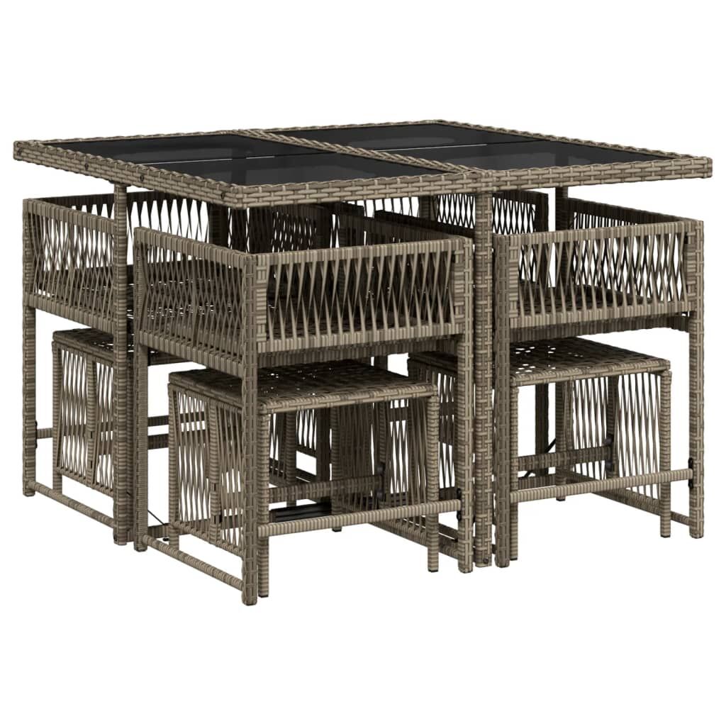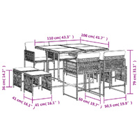 $531.95This garden dining set is a great choice for al fresco dining or just relaxing in the garden, backyard, or on the patio. Durable material: PE rattan, also known as poly rattan, is a strong, low-maintenance synthetic material that looks like natural rattan. It's lightweight, easy to clean, and commonly used for outdoor furniture due to its durability and weather-resistant properties.Compact storage: These chairs have a flap backrest that can be folded down, making it easy to store them under the table. When folded, they neatly fit under the table, forming a space-saving cube shape. Additionally, the stools can also be stored under the chairs, further maximizing space efficiency.Comfortable seat experience: This outdoor furniture, complete with thickly padded cushions, offers a comfortable seating experience.Removable and washable cover: These seat cushions feature removable covers for easy washing and maintenance. The cushion covers have a flap at the back for easy attachment to the backrests.Glass tabletop: The outdoor table's top is made from strong and durable tempered glass, making it easy to clean with a damp cloth and adding a touch of elegance to your outdoor space. Good to know:To make sure your outdoor furniture stays beautiful, we recommend protecting it with a waterproof cover.