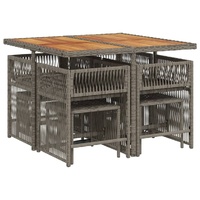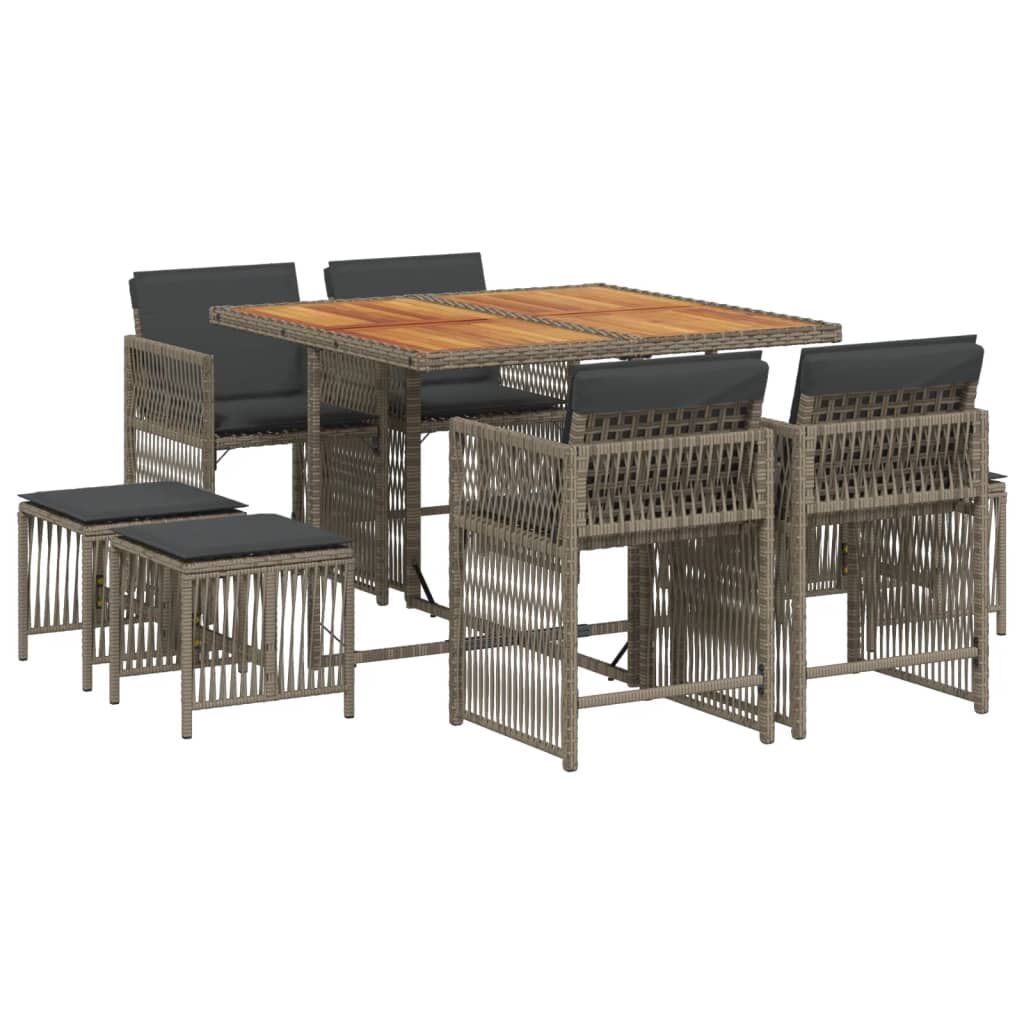 $504.98This garden dining set is a great choice for al fresco dining or just relaxing in the garden, backyard, or patio. Durable material: PE rattan, also known as poly rattan, is a strong, low-maintenance synthetic material that looks like natural rattan. It's lightweight, easy to clean, and commonly used for outdoor furniture due to its durability and weather-resistant properties.Compact storage: These chairs have a flap backrest that can be folded down, making it easy to store them under the table. When folded, they neatly fit under the table, forming a space-saving cube shape.Comfortable seat experience: This outdoor furniture, complete with thickly padded cushions, offers a comfortable seating experience.Removable and washable cover: These seat cushions feature removable covers for easy washing and maintenance. The cushion covers have a flap at the back for easy attachment to the backrests.Stable and easy-to-clean tabletop: This garden table has an acacia wood top that is sturdy, durable, and easy to clean with a damp cloth. Good to know:To make sure your outdoor furniture stays beautiful, we recommend protecting it with a waterproof cover.