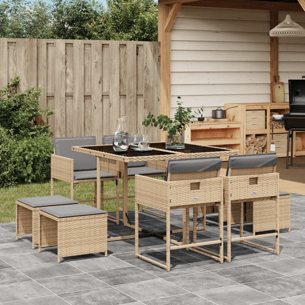 $455.69This garden dining set is a great choice for al fresco dining or just relaxing in the garden, backyard, or on the patio. Durable material: PE rattan, also known as poly rattan, is a strong, low-maintenance synthetic material that looks like natural rattan. It's lightweight, easy to clean, and commonly used for outdoor furniture due to its durability and weather-resistant properties.Compact storage: These chairs have a flap backrest that can be folded down, making it easy to store them under the table. When folded, they neatly fit under the table, forming a space-saving cube shape. Additionally, the stools can also be stored under the chairs, further maximising space efficiency.Comfortable seat experience: This outdoor furniture, complete with thickly padded cushions, offers a comfortable seating experience.Removable and washable cover: These seat cushions feature removable covers for easy washing and maintenance. The cushion covers have a flap at the back for easy attachment to the backrests.Glass tabletop: The outdoor table's top is made from strong and durable tempered glass, making it easy to clean with a damp cloth and adding a touch of elegance to your outdoor space. Good to know: To make sure your outdoor furniture stays beautiful, we recommend protecting it with a waterproof cover.