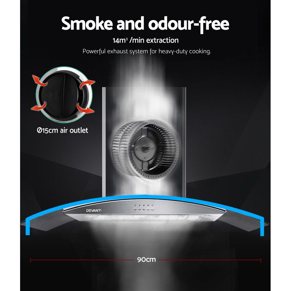 $179.99Frying, searing and grilling all the time? Cooking in an enclosed space can deteriorate the quality of air resulting in stifling odours all around. Let our Devanti Wall Mounted 900mm range hood help keep your home smoke and odour-free always. The stainless glass canopy operates quietly, consumes less power and comes with adjustable chimney. It features three selectable speeds to suit your cooking needs. The extra-large extraction area traps grease effectively and ensures a steady upflow. Thanks to a powerful motor and the 5-layer machine washable filter system that effectively filter out oil and fumes for better experience. It even comes with an automatic indicator to inform you that the filter is due for cleaning. Two clear and bright LED lights also provide vivid illumination of your cooking area that you would surely appreciate. Not least, the tempered glass is easy to clean and maintain.