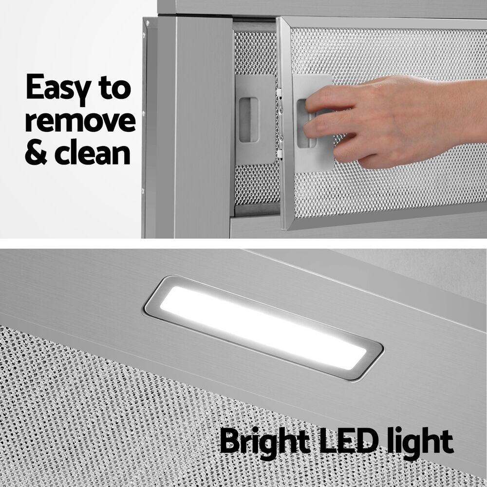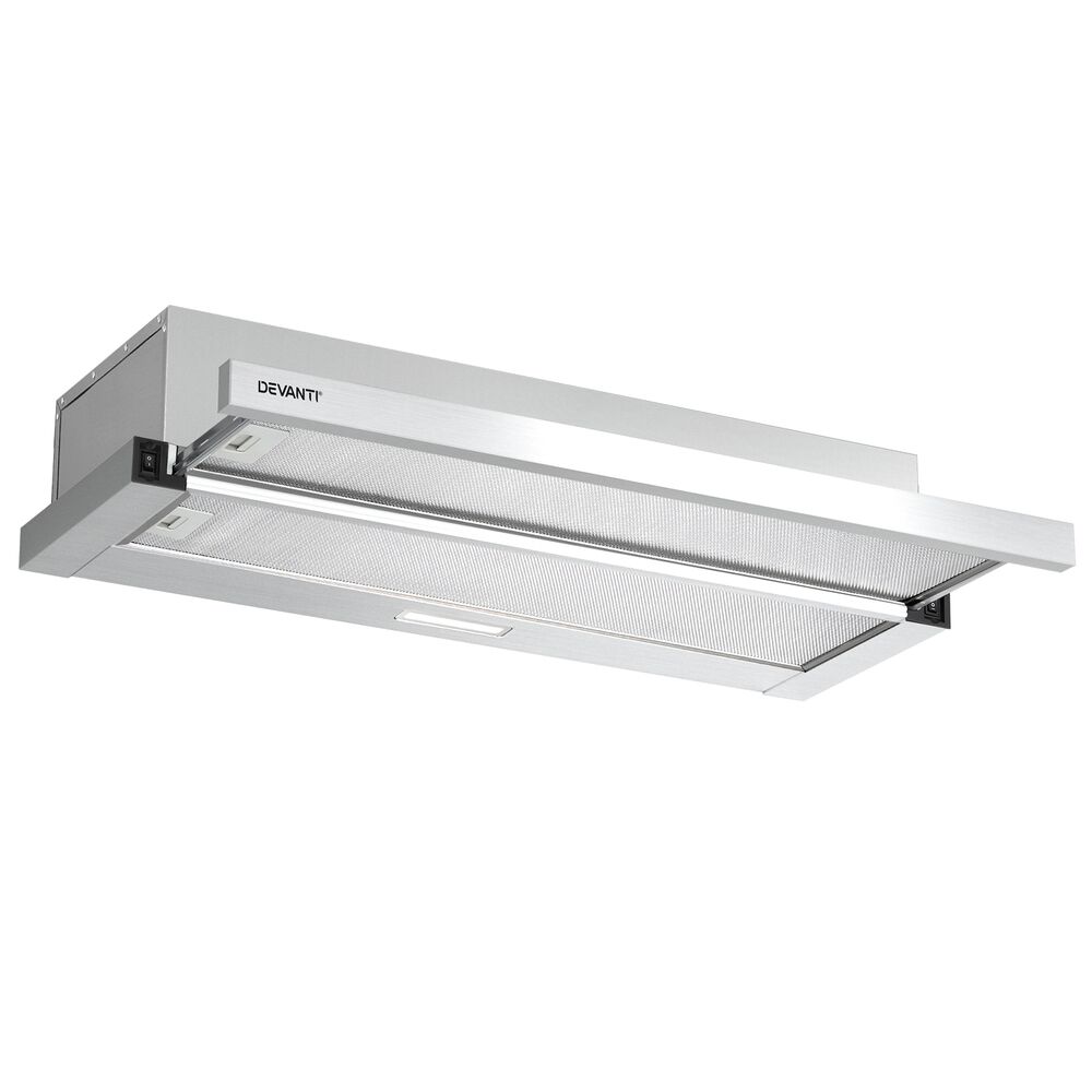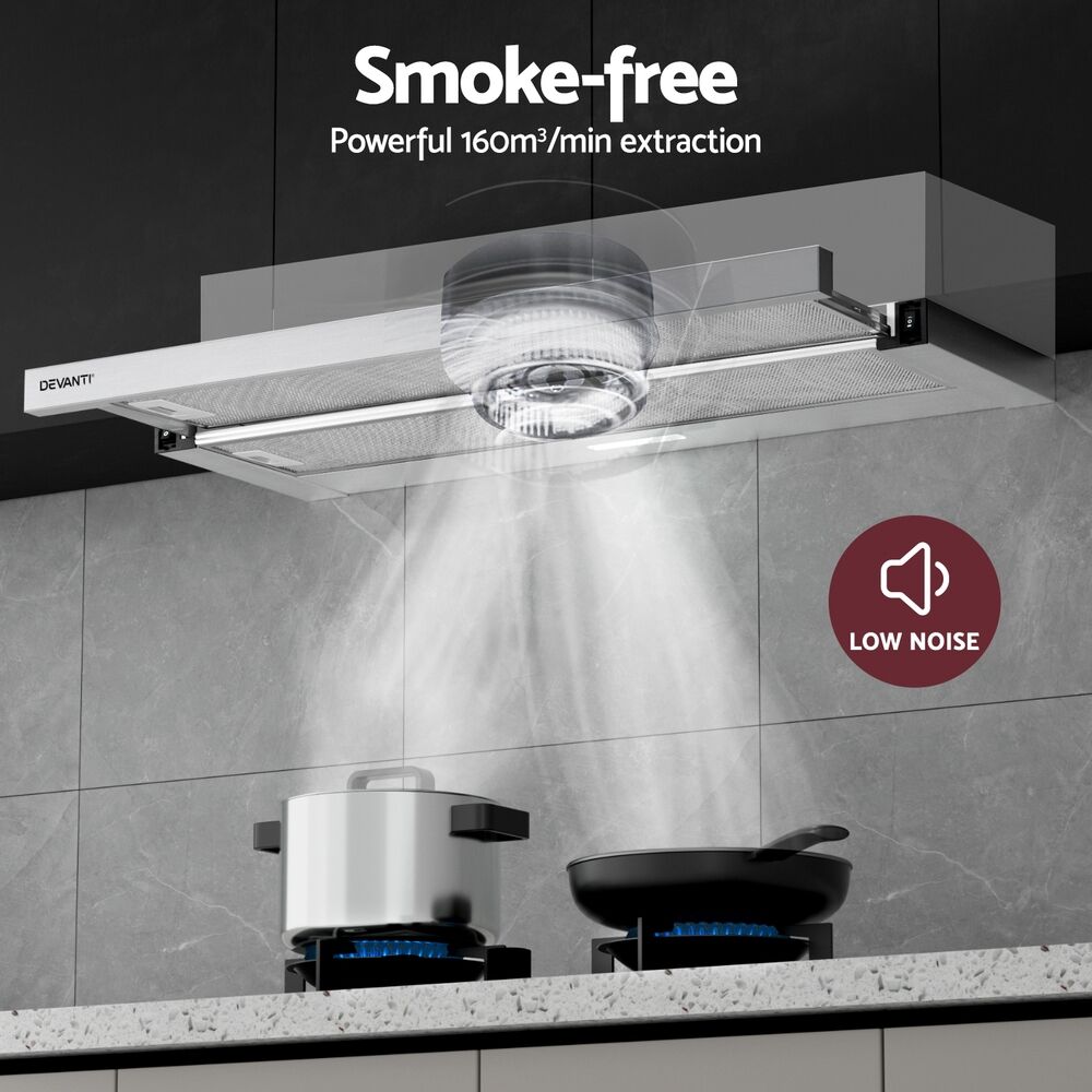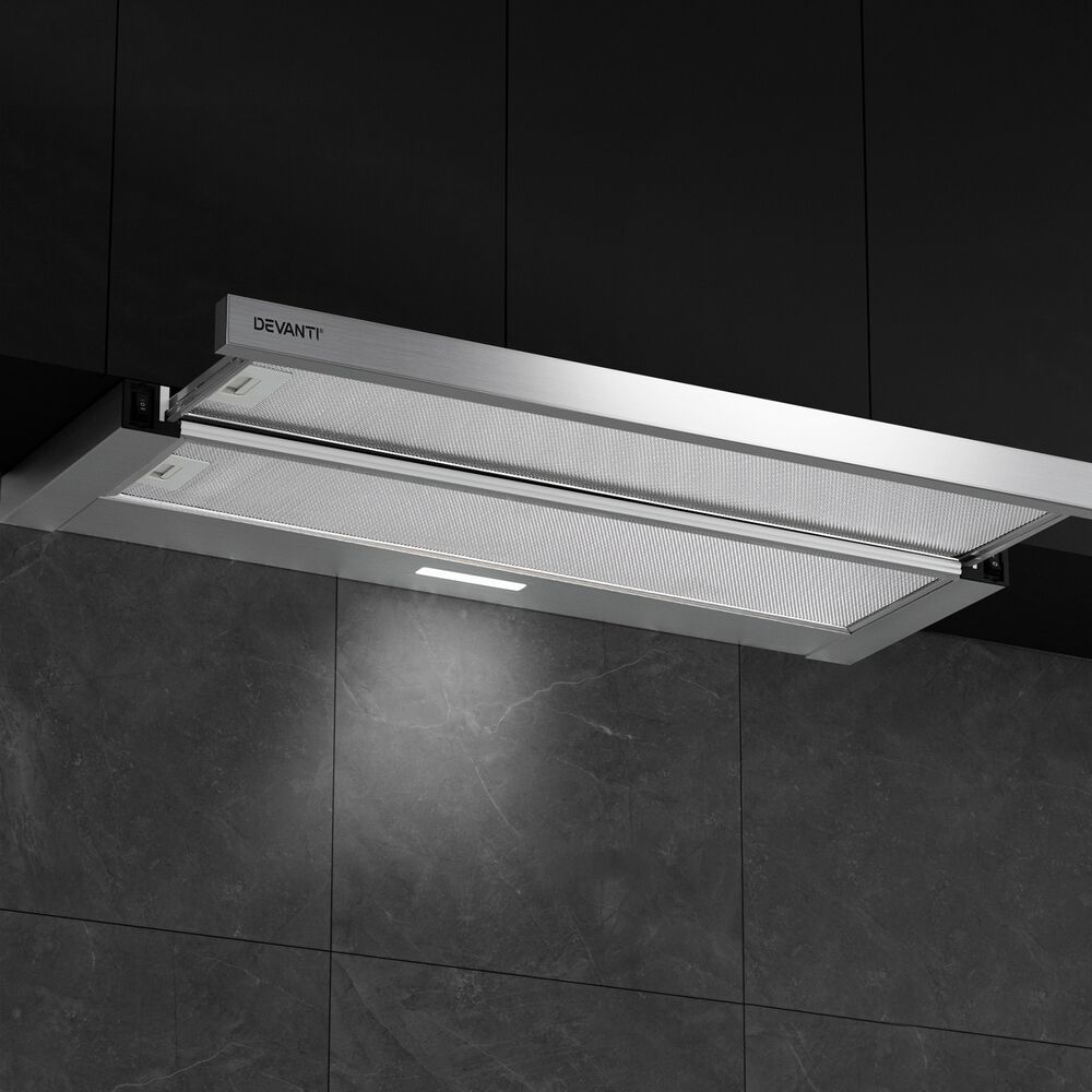 $112.52Do you suffer from stifling odours and stubborn smoke or steam from your cooking? Say goodbye to smells and stains with the Devanti 90cm Slide-out Range Hood. Made from Grade A stainless steel the range hood looks and functions perfectly for a busy kitchen. Featuring a powerful extraction rate of 160m/hr from a high-performance motor, our stainless-steel range hood will clear the air of smoke, steam, odours and vapours in no time. The non-stick and removable 3-layer aluminium grease filter ensures all grease is efficiently captured. Clear and bright LED lights provide vivid illumination for your cooking area, so you can see everything you're cooking. Completing the job is a 2-speed fan that can be easily selected with the push button controls. The range hood is easy to install and suitable for standard Australian plugs and both under-cabinet or wall-mounted installation. For clean and clear air in your home, you can't cook without a Devanti Slide-out Range Hood.