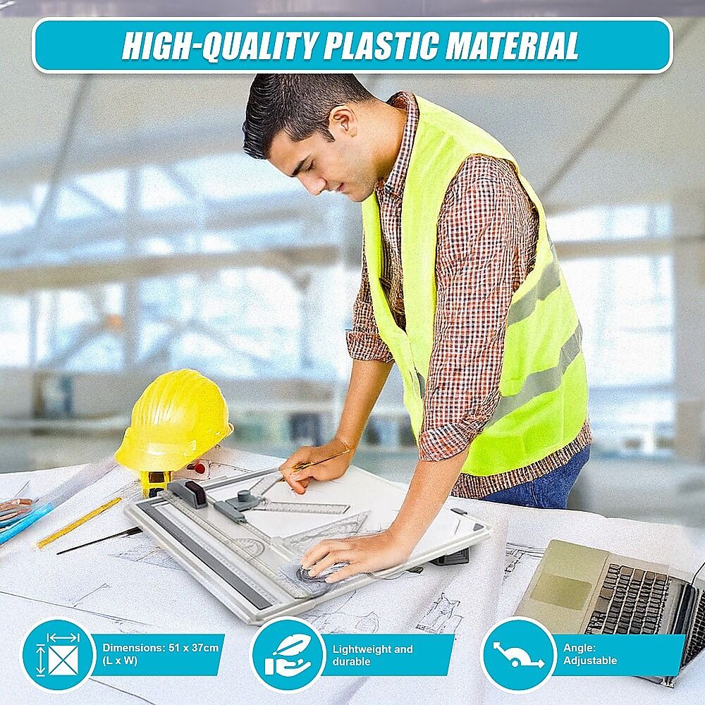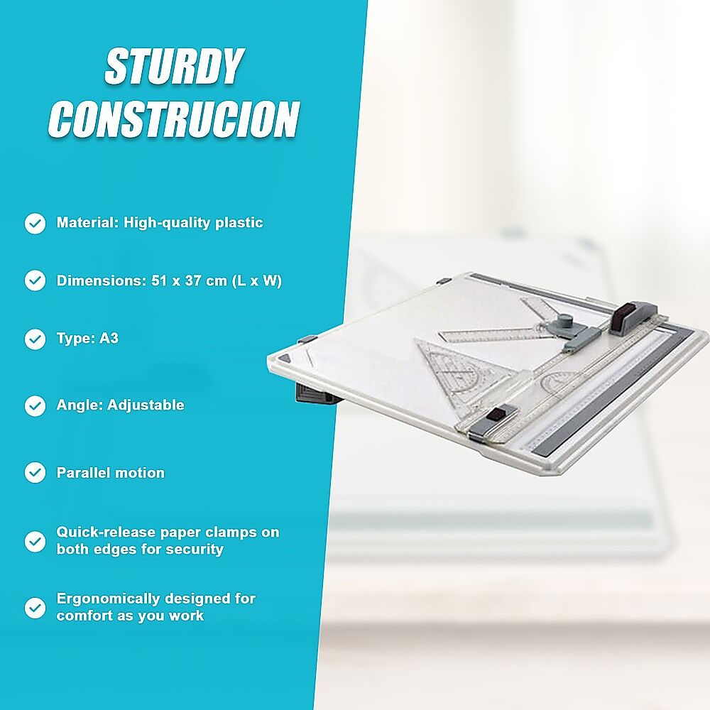 Crafted from high-quality plastic, this drawing board table set is as durable as it is light in weight. Two parallel rulers and corner clips ensure stability, making your drawings more accurate. Quick-release paper clamps on both sides secure your drawing paper.