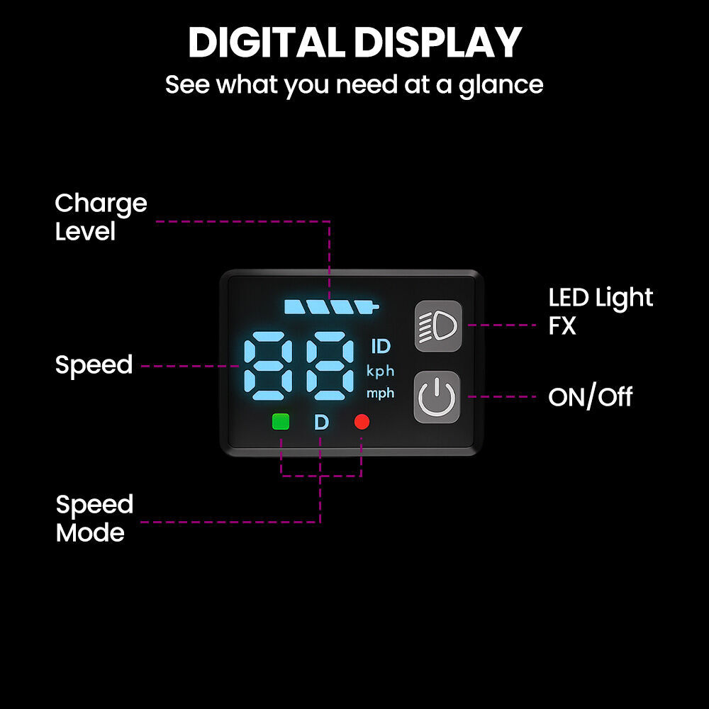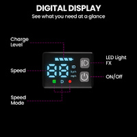The Digital Dash gives riders instant control of speed modes, light effects, and a clear view of speed and battery level. Add in the switchable Light FX, and every ride looks as good as it feels.
