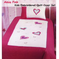 $85.49This Amia Hearts Embroidered Quilt Cover Set Single is a cute and stylish bedding set that is perfect for your kid's bedroom to add fun and love aura. It features an adorable applique heart design in bold colour hues of pink, hot pink, and aqua that will add decorative elements to any bedroom. It is made from soft touch and quality Polyester Cotton blend fabric with easy care properties and softness you can enjoy all night long.