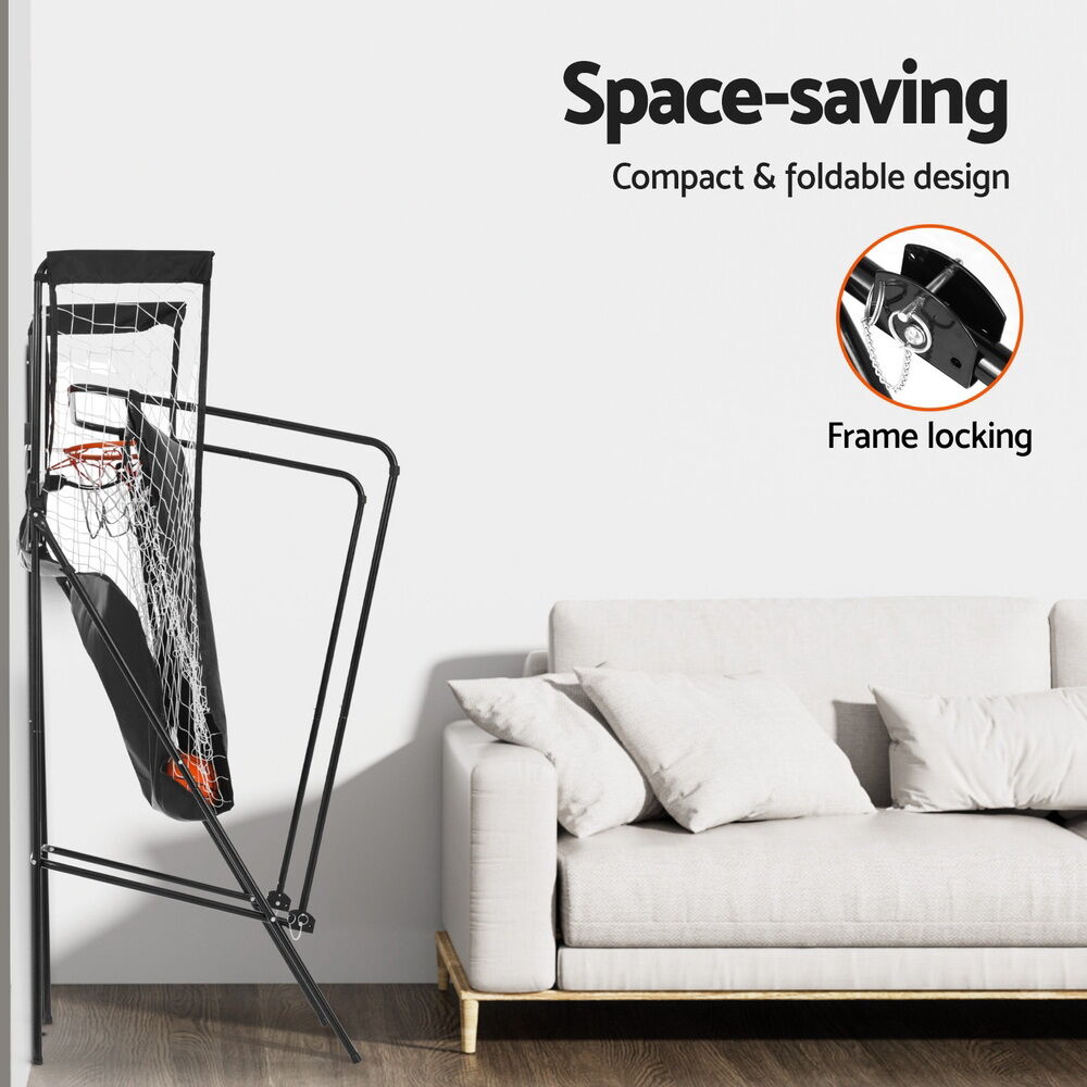 $114.38Bring the thrill of the arcade home with your very own Basketball Shooting Machine. The game is made from quality coated steel tubes that are rust-resistant as well as a waterproof and stain-resistant printed polyester fabric that is sturdy and durable, so you can use it indoors or outdoors. Realistic sound effects make you feel like youre at your local arcade hotspot. The LED automatic score counter provides an accurate and impartial referee for two players, no fighting on the courts! The high net catches stray balls and returns them quickly and easily so you can get back to fun. The triangle frame design, secure lock and anti-slip feet always keep the game stable. With a foldable, portable and easy-to-assemble Velcro design, you can play basketball in minutes, whether at home or on the road. Includes two additional basketballs so you can keep shooting for the stars, no interruptions! Game on to victory with your very own arcade-style Basketball Shooting Machine.