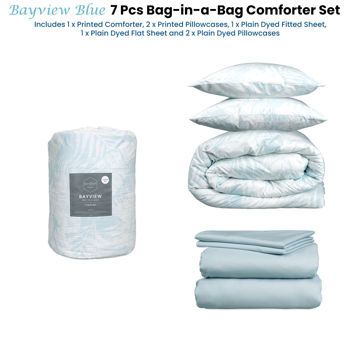 $148.49Our Bayview Blue 7 Pcs Bed-In-A-Bag Comforter Set with Sheet Set by Ardor features cool misty blues reminiscent of coastal getaways. The textured palm print design of the comforter and pillowcases will add subtle detail to your bedroom and is perfectly complimented by the matching soft blue sheets included in the set. Great for those unexpected guests too!