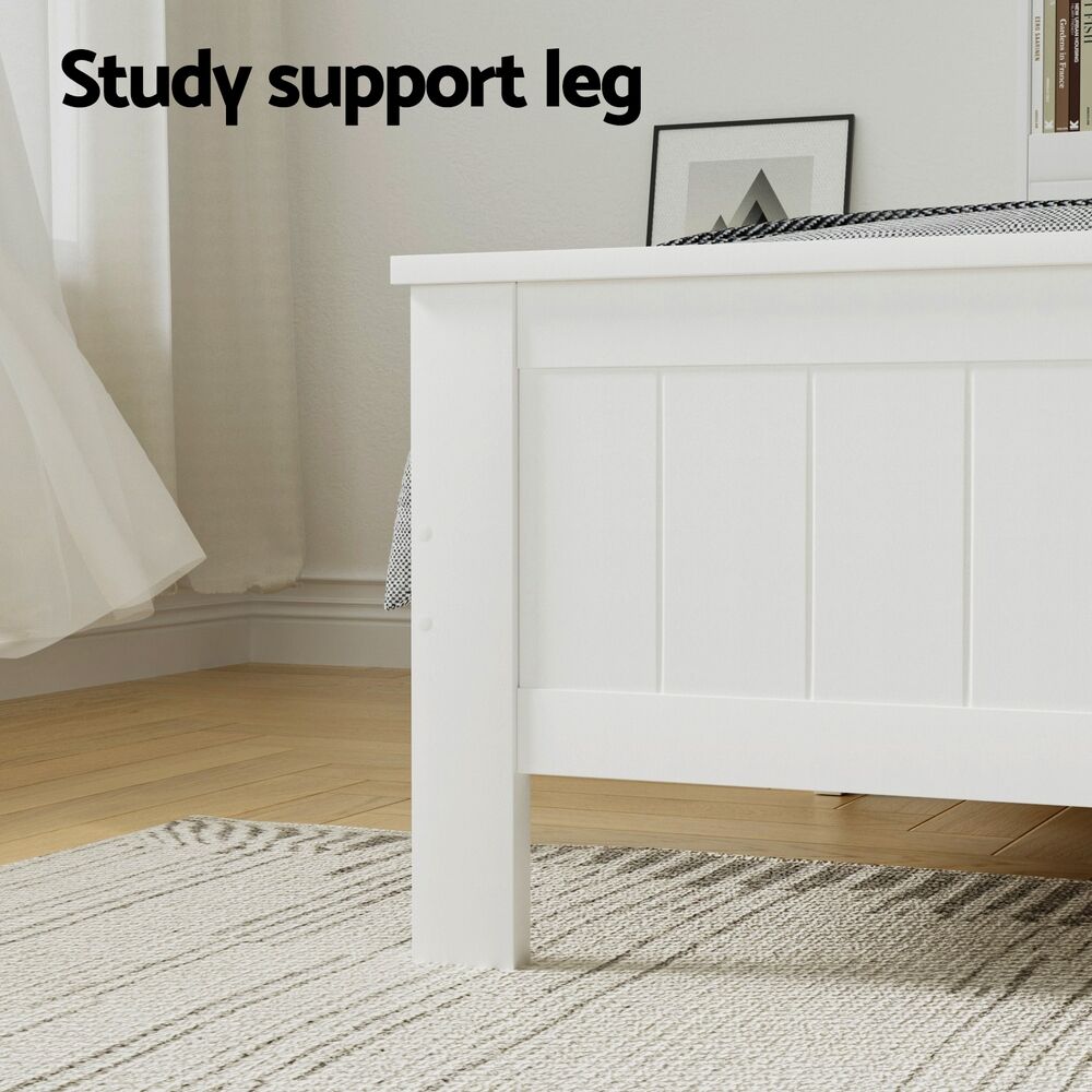 Made of natural pine wood, the Artiss Conqueror Bed Frame is ideal for kids as it for any adult. Strong and sturdy, the bed frame comes with a solid plywood slated base, reinforced supports across the frame, heavy-duty steel fixings and smooth edges all round. Finished in a non-toxic, eco-friendly white paint, the neutral coloured bed frame is also very practical with ample storage from a headboard that comprises three open compartments and a closed shelf that folds down as well as more room beneath the bed frame for optional trundle drawers or any storage boxes. Fact it, this charming bed frame is designed to please in more ways than one.
