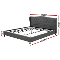 This Artiss King Bed Frame combines a wingback headboard with grey linen upholstery and high-density foam padding. Features a sturdy steel frame with reinforced bars, heavy-duty connectors, and a wooden slat base. Includes adjustable centre support. Fits standard Queen mattresses (203x183cm). Modern design for bedrooms. Overall dimensions: 214x196x104cm.