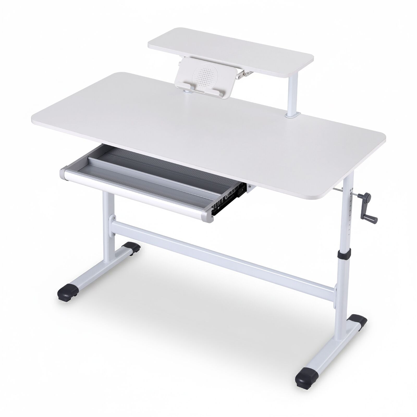 Create an organised and comfortabl study or workspace with this Artiss manual standing desk. Perfect as a study desk or home workstation, it features a smooth hand-crank mechanism for easy height adjustment. The built-in drawer helps keep supplies tidy, while the upper shelf offers extra space for books or decor. An integrated holder keeps your phone or iPad within reach. Supported by a sturdy brace, this adjustable desk provides reliable stability for your workday.