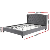 This Artiss Queen Bed Frame combines a wingback headboard with grey linen upholstery and high-density foam padding. Features a sturdy steel frame with reinforced bars, heavy-duty connectors, and a wooden slat base. Includes adjustable centre support. Fits standard Queen mattresses (203x153cm). Modern design for bedrooms. Overall dimensions: 214x166x104cm.