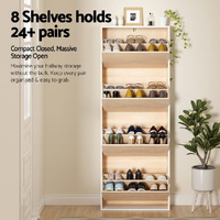 This 160cm height shoe cabinet features 4 flip-up drawers and 8 tier shelves (adjustable middle shelves) for optimal shoe storage. Crafted from premium particle board with hard-wearing melamine finish, it withstands daily Aussie wear. High weight capacity holds up to 24 pairs of shoes (size dependent). Includes wall attachment kit for secure entryway placement. Transform cluttered spaces with this versatile shoe rack solution!