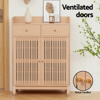 The Artiss Shoe Rack provides versatile storage for your footwear, featuring adjustable shelves and pull-out drawers to hold up to 16 pairs of shoes. Crafted from particle board with a paper veneer, this rack includes ventilated doors, pine wood legs, and a wall attachment for simple installation.