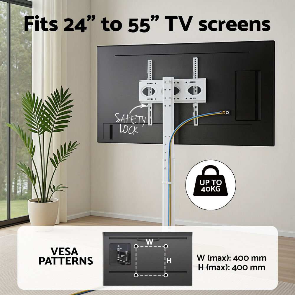 Comprising a strong tempered glass base and a solid metal frame, the Table Top TV Stand is perfect for mounting any TV screen between 24 and 55". It is also compatible with various VESA measurements. The integrated design simply looks stunning, especially with its sleek black finish and easily sits on any flat furniture with minimum fuss. Designed with smooth-rolling wheels for easy mobility, the tempered glass base allows effortless repositioning across rooms. The TV Stand design is also such that you can run cables behind the TV neatly for a well-concealed look. Better still, the screen can swivel up to 30 degrees on either side for preferred viewing angles. Not least, you can safely place a sound bar or mini component system on the base to complete a great entertainment centre.