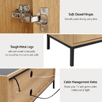Crafted from E1 15mm PB with durable melamine veneer, its sturdy construction stands on metal feet with protective foot pads to safeguard timber floors. Thoughtful details include dual cable management holes for tidy cord control and an included anti-tip kit for family safety.