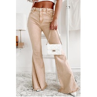 • Khaki Raw Edge Mid Waist Flared Jeans