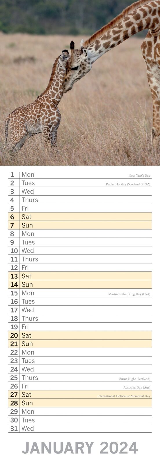This beautifully designed 2024 Slimline Wall Calendar is perfect for your home or office and is the perfect Holiday present for your loved ones. This slimline wall calendar is carefully shrink-wrapped and is only 14.5cm (5.7") wide making it the perfect size to hang in narrow and tight spaces. While being very slim, this calendar is long enough, presenting each day on a separate line, giving you plenty of space to write your important occasions. SPECIFICATIONS:
