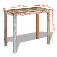 $361.79This antique-style wooden bar table will make a unique addition to your home. Its solid wood construction makes it stable, sturdy and suitable for everyday use. It can also be used as a dining table or breakfast bar. This vintage table is made of solid reclaimed wood, which means that every piece of furniture is unique and slightly different from the next. Furniture made from reclaimed wood has the characteristics of different woods like teak, mango wood and acacia. Reclaimed wood is solid, stable, durable, and beautiful. Signs of wear and visible grain structure give each piece its own history and a unique look. The bar table is fully handmade, and the craftsmanship adds to its spectacular retro style. Every step of the process is carried out with the greatest care, be it recombining, polishing, painting or waxing. Important note: Colours vary from piece to piece, making each of our bar tables unique. The delivery is random, ensuring the exclusivity and individuality of your product.