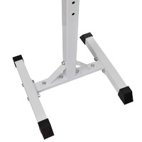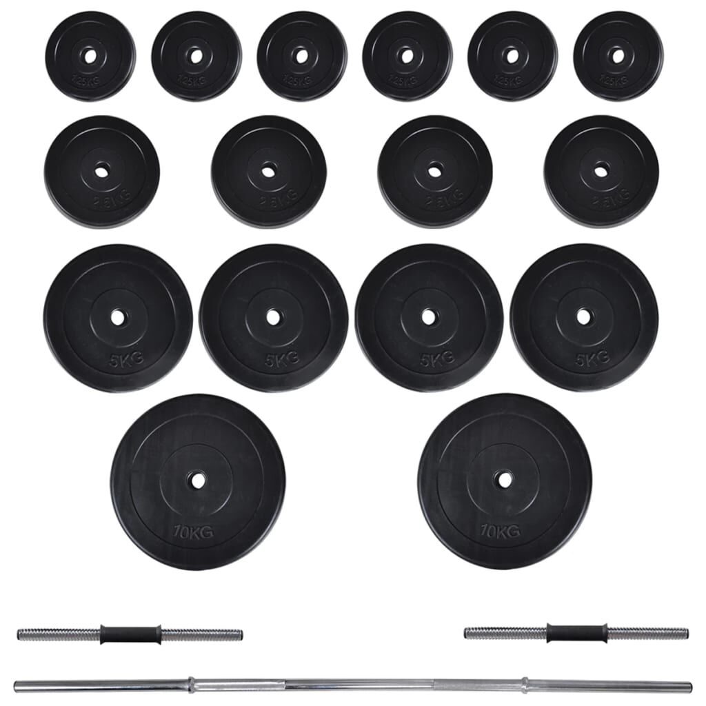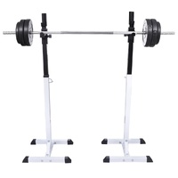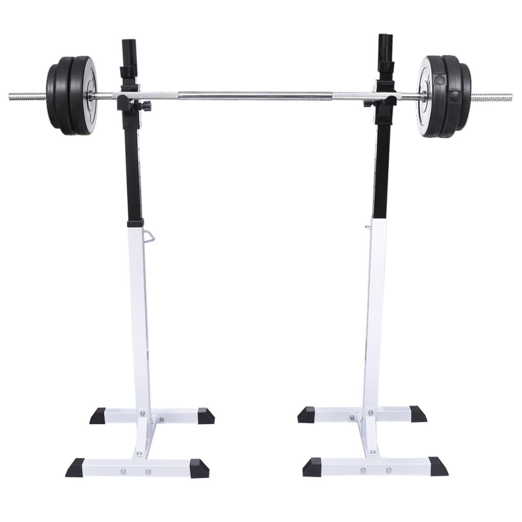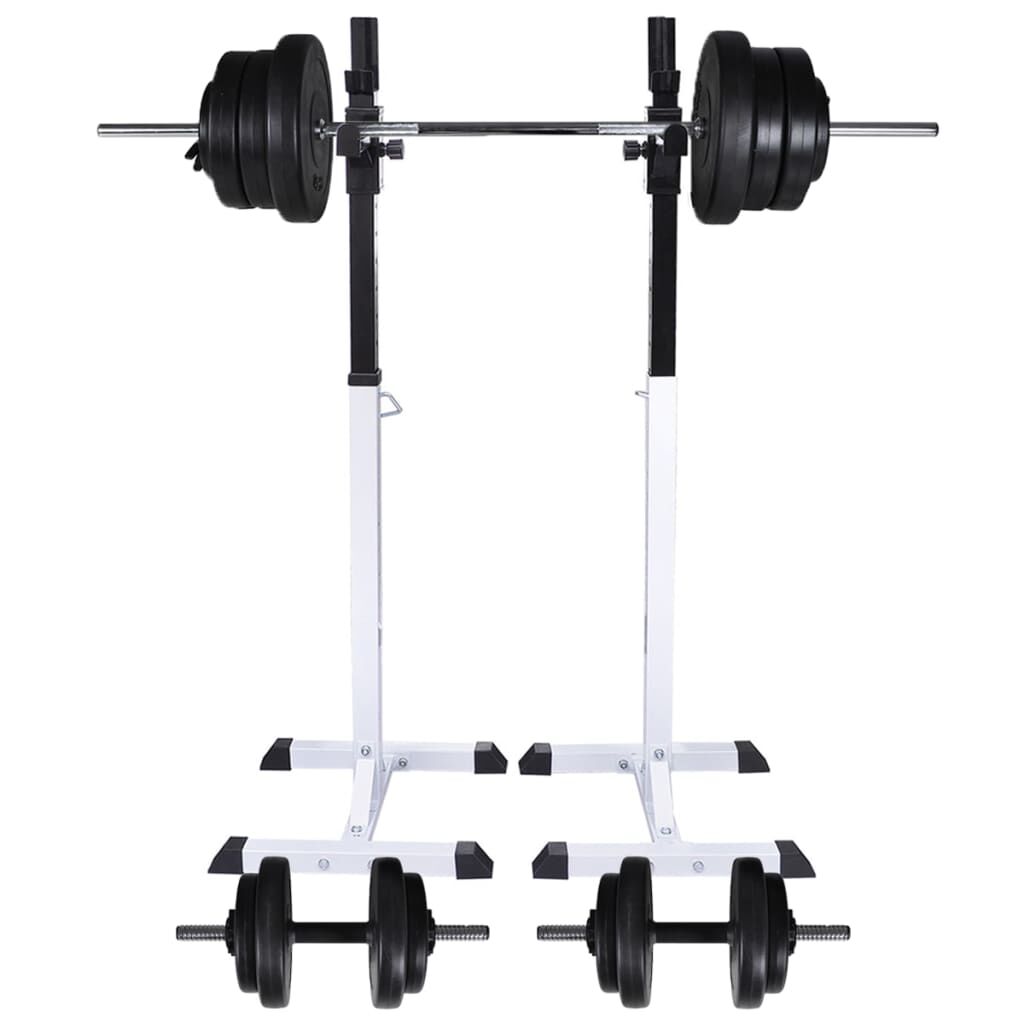 $334.79This robust and stable barbell/squat rack with a barbell and dumbbell set is perfect for your home gym! In combination with a workout bench, it will be suitable for bench press training as well as squats. This stable barbell rack is suitable for barbell bars with a diameter of approximately 45-50 mm. It has a rugged steel construction and a maximum load capacity of 80 kg. The rack is adjustable in height and suitable for almost any body size and various exercises. Moreover, it is compact and space saving. The barbell and dumbbell set features solid chrome-plated bars with quick-action spring collars (for barbell bar), non-slip knurled grips, and fluted star-screw caps (for dumbbell bars) for secure attachment of the weight plates. You can work out without worrying about safety issues. The weight plates are made with a robust polyethylene casing. They can be combined in various ways for different training purposes. Delivery includes a barbell/squat rack, a barbell bar, two dumbbell bars, six 1.25 kg weight plates, four 2.5 kg weight plates, four 5 kg weight plates, two 10 kg weight plates, four caps and two spring collars.
