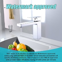 Your purchase of this basin mixer also comes with peace of mind. The mixer is Australian Certified and Watermark approved, complying with AS/NZS 3718:2005 which ensures consumers of quality plumbing products. This product is also WELS-approved with a 4-star water efficiency rating of 6.08 Litres per minute. That's smart for your water bill and smart for the environment.
