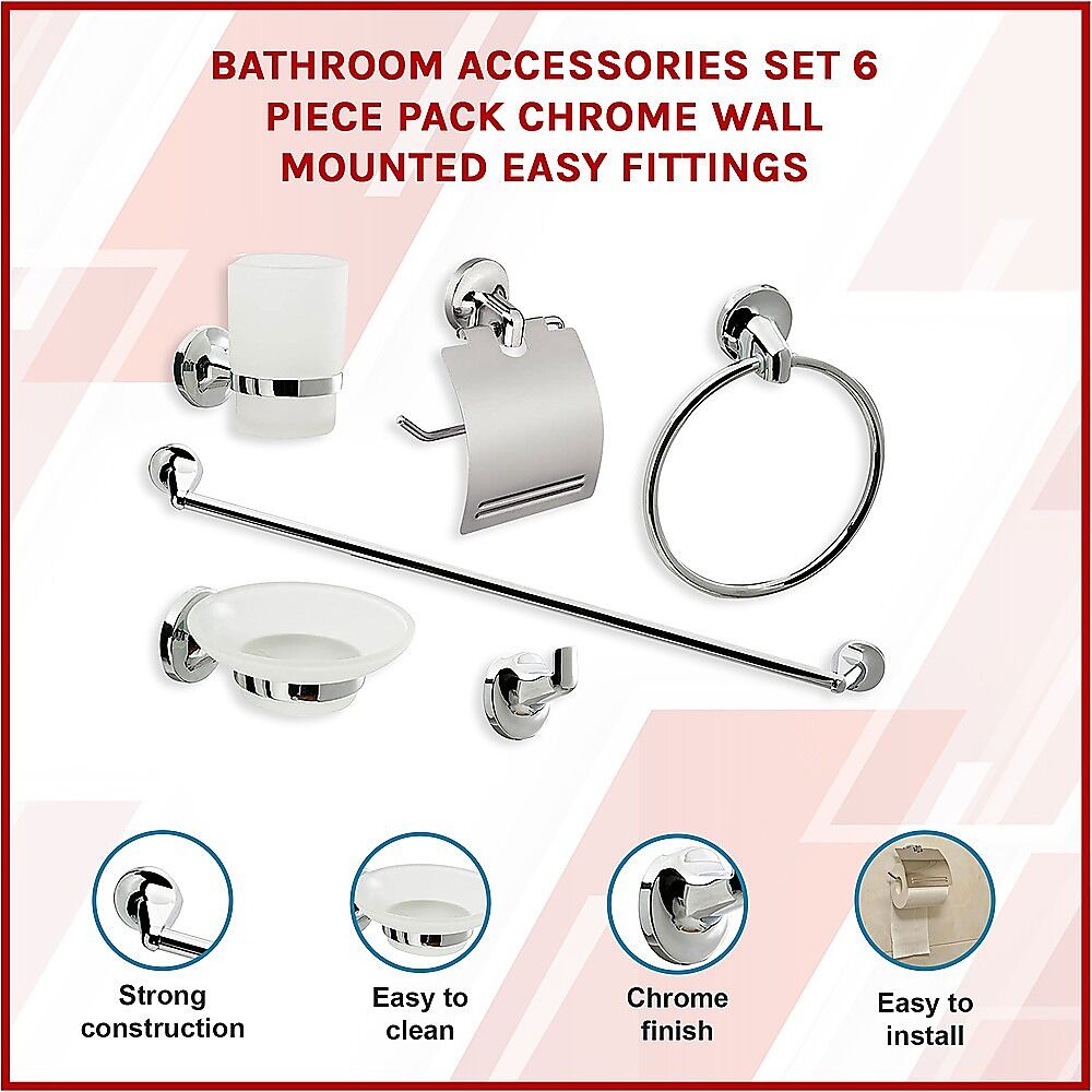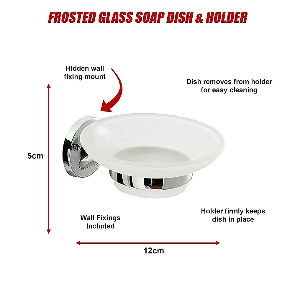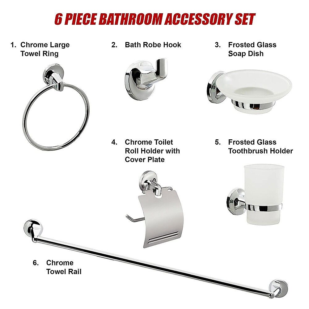 $44.99This premium bathroom basin accessory kit features a comprehensive selection that includes the frosted tumbler glass for toothbrushes, a frosted soap dish, a towel ring, a towel rail, a robe hook, and a toilet roll holder with a cover. These six individual accessories perfectly complement each other, creating a cohesive and stylish chrome bathroom set.