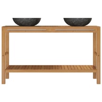 NOW $388.73This stylish wooden bathroom cabinet with two sinks with beautiful yet simplistic style is a perfect match for your bathroom or washroom decor. The sink cabinet is constructed from solid teak wood which is durable and sturdy enough to place a basin on the top, including other bathroom accessories. The vanity cabinet has a handrail for hanging towels or clothes. It also has four supporting legs to ensure stability and dryness above the ground. The striking basin is user-friendly for everyday use and is a wonderful adornment for your living space. Fully handmade of graceful marble, the basin is extremely sturdy with an elegant look. Additionally, the washbasin is very easy to clean. The cabinet fits perfectly under your sink and makes bathroom storage quite convenient. Note: Marble is a natural product and colour differences might therefore occur. The real product might be lighter or darker than in the photos and sometimes there might be a mix of colours in the product.