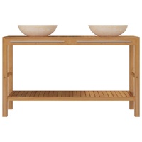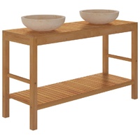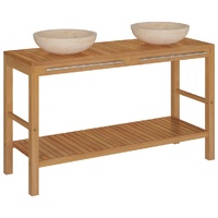 This stylish wooden bathroom cabinet with two sinks with beautiful yet simplistic style is a perfect match for your bathroom or washroom decor. The sink cabinet is constructed from solid teak wood which is durable and sturdy enough to place a basin on the top, including other bathroom accessories. The vanity cabinet has a handrail for hanging towels or clothes. It also has four supporting legs to ensure stability and dryness above the ground. The striking basin is user-friendly for everyday use and is a wonderful adornment for your living space. Fully handmade of graceful marble, the basin is extremely sturdy with an elegant look. Additionally, the washbasin is very easy to clean. The cabinet fits perfectly under your sink and makes bathroom storage quite convenient. Note: Marble is a natural product and colour differences might therefore occur. The real product might be lighter or darker than in the photos and sometimes there might be a mix of colours in the product.