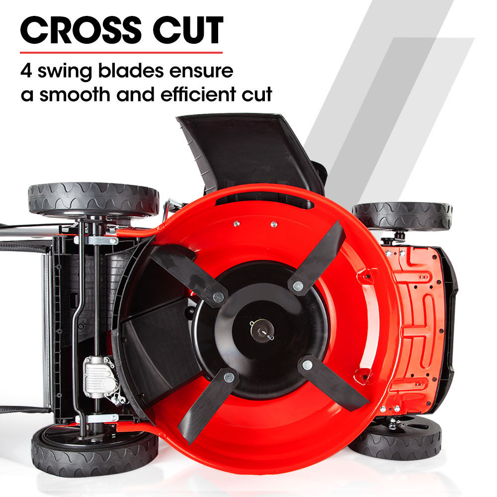 The absolute world class quality is complemented by all the features you need; 7 Stage central height adjustment, a heavy-duty 21' steel deck and quick release folding handles. 4-in-1 functionality offers the option of catching, mulching, direct side discharge or direct rear discharge. The large 21' deck with oversized wheels and self-propelled design will ensure mowing is a leisurely stroll for any sized property. And with CrossCut swing blades you'll always end with a perfectly cut lawn that your neighbours will envy!