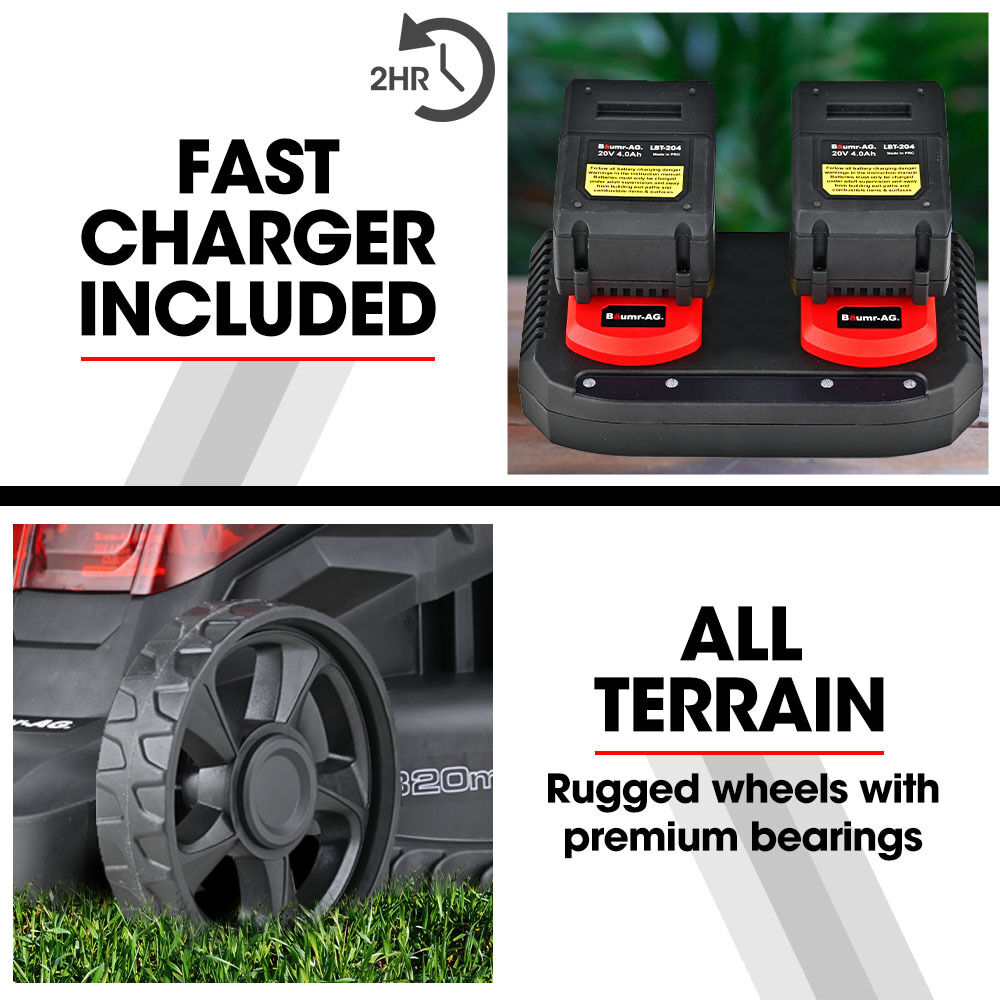 It starts humming in an instant via the child safe starting system. With its powerful advanced brushless motor, it can slice through tough grass with ease! The 450CX houses two long-lasting Baumr-AG SYNC 20V 4Ah batteries that provide 40 volts of cutting-edge technology. For ultimate convenience, the Baumr-AG SYNC batteries are compatible with the wide range of Baumr-AG cordless electric garden and workshop power tools. Recharge your batteries in the included dual battery fast charger, ready for action in just 2 hours.