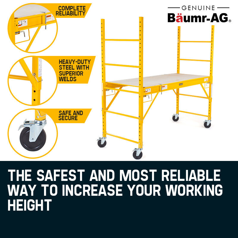 This piece of equipment is a must have for handymen and DIYers. It disassembles into a slim, flat package taking up minimal space, while providing the safest and most practical way to achieve elevated work. Reach new heights with your work and order your very own Baumr-AG Mobile Adjustable Scaffold today!
