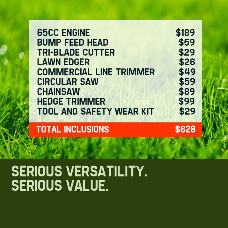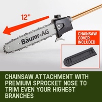 Utilising premium anodized commercial alloy, your Baumr-AG features commercial grade quick connect couplings equipped with dual ball-bearing floating centres. While its extensions reach from 2.3 up to a massive 4 metres, genuine commercial nine spline fastening ensures maximum stability - a must for safely tackling those hard to reach branches. Built tough, your Baumr-AG boasts unparalleled levels of quality backed by an extensive 12 month warranty. Buy now and this amazing package comes loaded with a bonus accessory kit, including protective goggles, gloves, earmuffs, mini toolkit and fuel mixer.