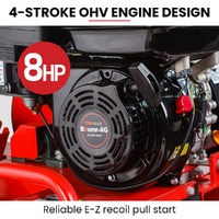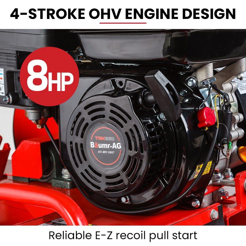 Known for their practical and innovative designs, Baumr-AG has once again exceeded industry standards. The powerful TRN660 has an 8HP 4-stroke OHV engine, with forced air-cooled performance and trenching speeds of up to 60 metres per hour. Starting is a breeze with an easy-to-pull recoil start. Convenient controls—throttle lever, stop switch, emergency stop, and lever-activated wheel lock—are on the handlebars for easy and safe operation.