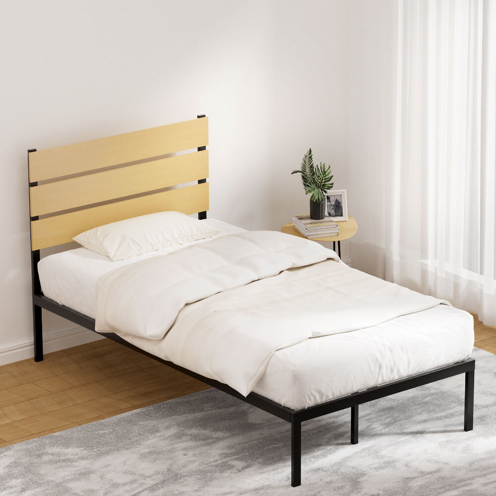 $114.38Looking for an affordable bed frame that doesn't compromise on quality or style? Look no further than the PAULA Bed Frame from Artiss. This rustic-style bed frame features an enhanced powder-coated and rust-resistant steel frame with strongly reinforced steel centre slats to keep your mattress securely in place and well-ventilated. The strong centre support beams give the bed a solid weight capacity of 150kg. Topped with a solid MDF headboard, this frame creates a clean, classic look that will transform your bedroom into a pastoral-style getaway. It features ample space underneath to fit trundle drawers or other storage solutions, perfect for keeping your bedroom tidy. The simple design ensures that it will complement any bedding or decor you choose to pair it with. Fits standard Australian-sized king single mattress. Practical, functional and stylish, the PAULA Bed Frame from Artiss is an easy purchase.