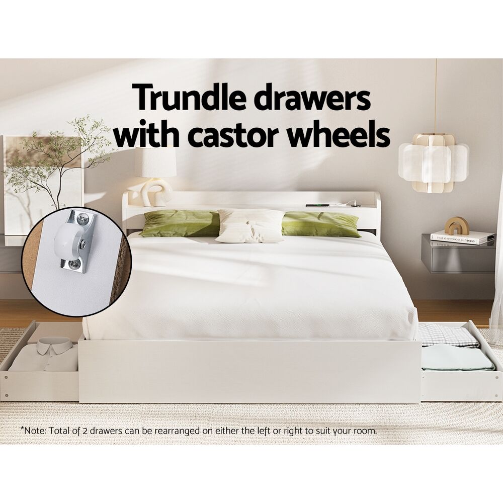 $336.29It's easy to sleep well on the Artiss Aura Bed Frame. Made from thick 15mm and 18mm particleboard with 12mm plywood slats and a white paper finish, the bed frame is designed for long-lasting use and longer-lasting sleep. The thick plywood slats and centre beams provide total support, and noise-free use, and improve the life of your mattress. It features a multifunctional design that allows you to use the bed for storage and to charge your phone overnight. Two drawers with smooth castor wheels can be installed on the left or the right for convenient storage. The headboard has smooth edges and plenty of room for your bedroom essentials. It also features two USB charging ports connected to a 200cm cable for convenience. While you power down for the night, you can power up with the Aura Bed Frame from Artiss.