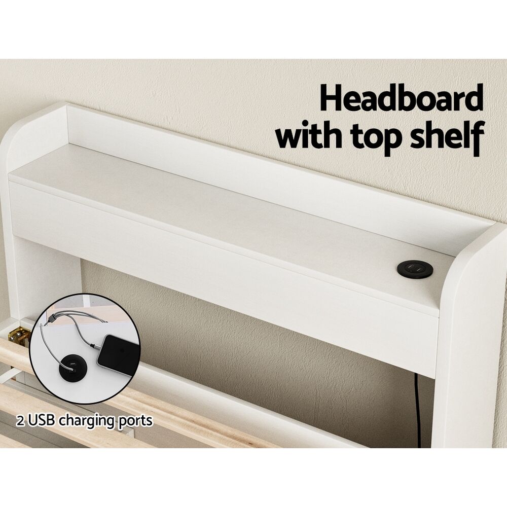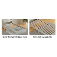 $242.24It's easy to sleep well on the Artiss Aura Bed Frame. Made from thick 15mm and 18mm particleboard with 12mm plywood slats and a white paper finish, the bed frame is designed for long-lasting use and longer-lasting sleep. The thick plywood slats and centre beams provide total support, and noise-free use, and improve the life of your mattress. It features a multifunctional design that allows you to use the bed for storage and to charge your phone overnight. Two drawers with smooth castor wheels can be installed on the left or the right for convenient storage. The headboard has smooth edges and plenty of room for your bedroom essentials. It also features two USB charging ports connected to a 200cm cable for convenience. While you power down for the night, you can power up with the Aura Bed Frame from Artiss.