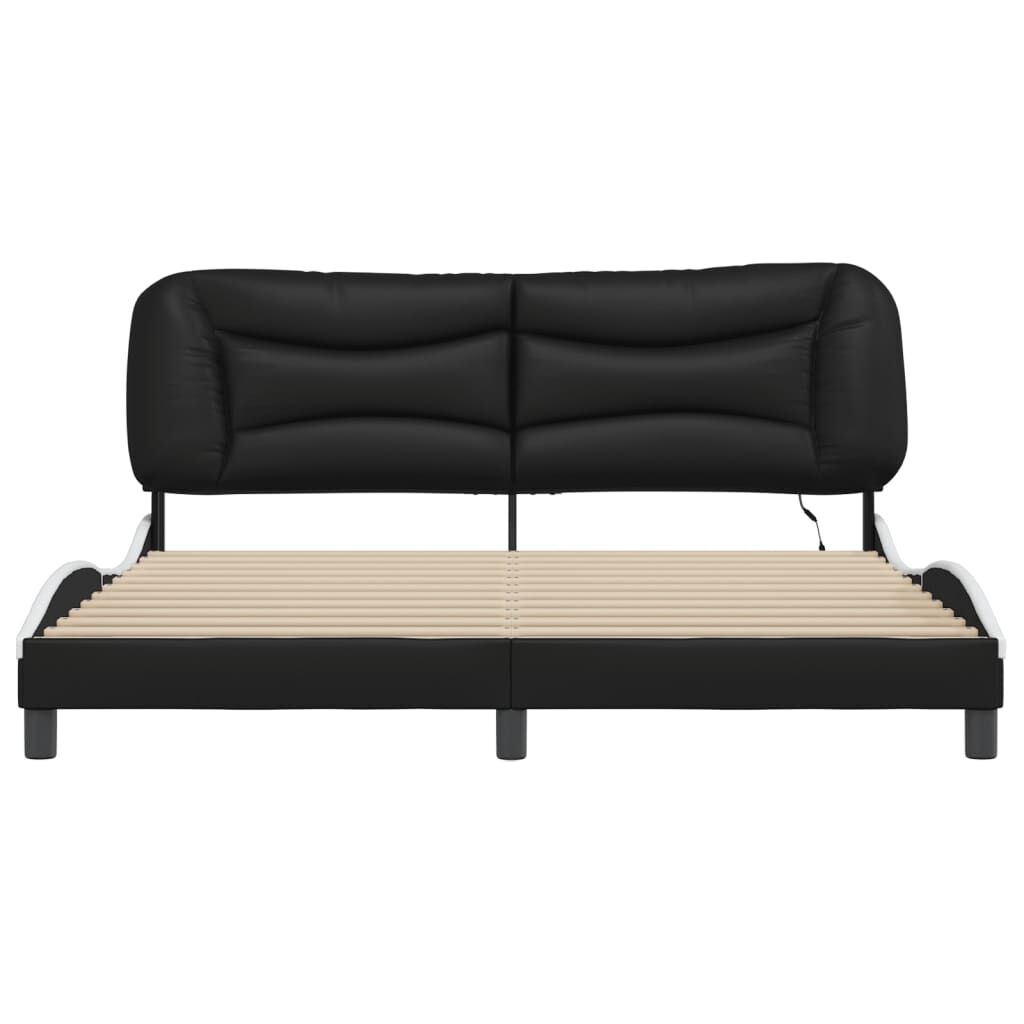 Get a better restful night's sleep from this bed frame with LED lights! It makes a welcoming addition to any bedroom. Durable faux leather: Premium faux leather is a highly durable material. It is resistant to stain, making it easy to clean with a damp cloth. The smooth surface also gives a luxurious look and the beauty of real leather.Plywood slats: The plywood slats provide good weight distribution, ensuring that the mattress stays in place with every twist and turn of your body during sleep.Excellent support: The headboard pillow is stuffed with PP fibre for ultra-soft and optimal comfort, providing you with excellent back support while you're sitting up in bed to read or watch TV.Colourful LED strip: Bring playfulness into darkness with colourful LED lights! The hook and loop fasteners on the back of the headboard cushion can be used to secure the LED lights.Waved side design: The waved look of the bed frame is stylish and sophisticated, adding a modern and elegant touch to your decor, making it the focal point of your bedroom. Good to know:A mattress is not included with this bed. We do offer a various selection of mattresses. You can check our shop for a matching mattress.The product has a USB connector that requires a certified 5V USB power source (not included).
