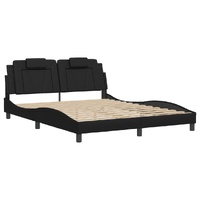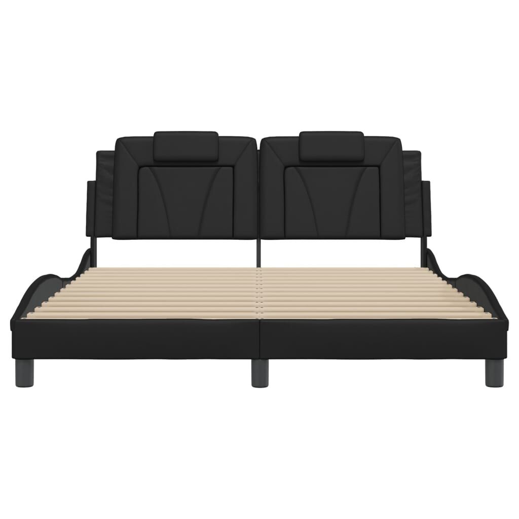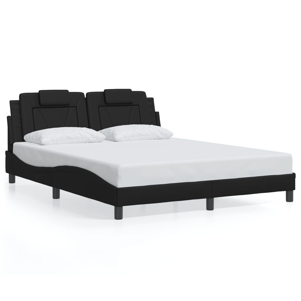 Get a better restful night's sleep from this bed frame with headboard! It makes a welcoming addition to any bedroom. Durable faux leather: Premium faux leather is a highly durable material. It is resistant to stain, making it easy to clean with a damp cloth. The smooth surface also gives a luxurious look and the beauty of real leather.Plywood slats: The plywood slats provide good weight distribution, ensuring that the mattress stays in place with every twist and turn of your body during sleep.Excellent support: The headboard pillow is stuffed with foam for ultra-soft and optimal comfort, providing you with excellent back support while you're sitting up in bed to read or watch TV.Convenient design: The cushion headboard has a zipper for easy installation, and the hook-and-loop fasteners on the back can be used to secure the LED lights.Waved side design: The waved look of the bed frame is stylish and sophisticated, adding a modern and elegant touch to your decor, making it the focal point of your bedroom. Good to know:A mattress is not included with this bed. We do offer a various selection of mattresses. You can check our shop for a matching mattress.