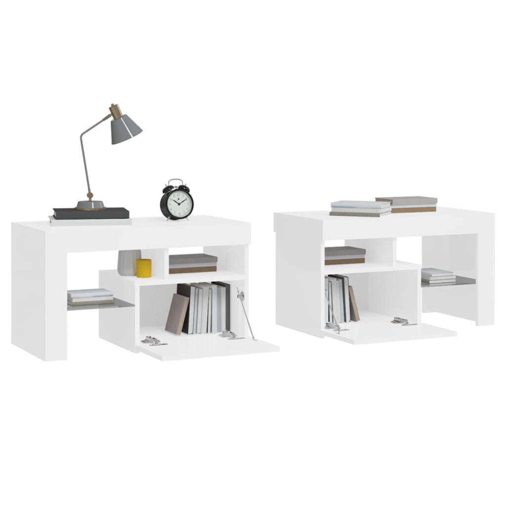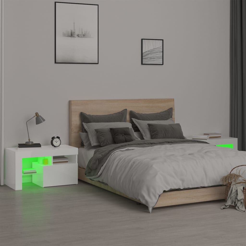 $174.59Anchor your living space in contemporary charm with these elegant bedside cabinets! Featuring a trendy yet practical design, these bedside cabinets with LED lights definitely become a focal point of your room. Durable material: The engineered wood is of exceptional quality with smooth surface and also features strength, stability and resistance to moisture. Colorful LED lights: The cabinet features RGB LED lights, which has different menus to change the colour of lights and let the colour adjust automatically differently. The LED lights underline the modern look and contribute to the trendy feeling.Ample storage space: The bedside table provides plenty of storage space for keeping your magazines, books, remote controls and other small items well-organised and within easy reach.Displaying function: The sturdy top of side cabinet is ideal for displaying decorative objects, photo frames, or potted plants. Note:The product has a USB connector, but the certified 5V USB power source is not included.Each product comes with an assembly manual in the box for easy assembly.