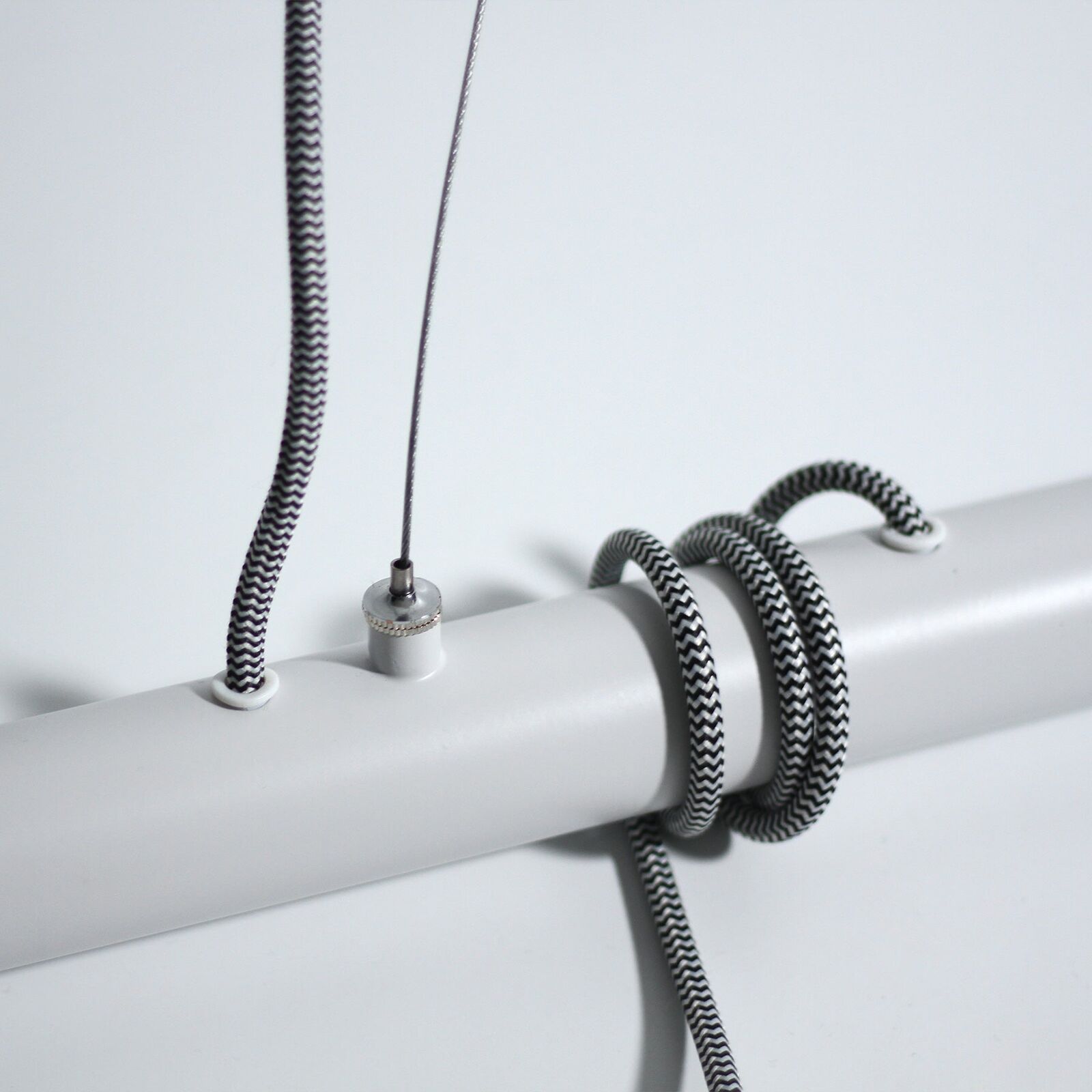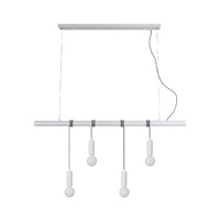 The four globe holders that drop from the lighting bar each have long grey braided cords that can be wrapped around the lighting bar to set heights individually. The heights can set to your preference, whether after a staggered look, or a short non-invasive drop, or a long, purposeful hang. The Bikkel Four Light Pendant comes in black and white and requires four E27 globes.