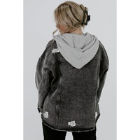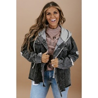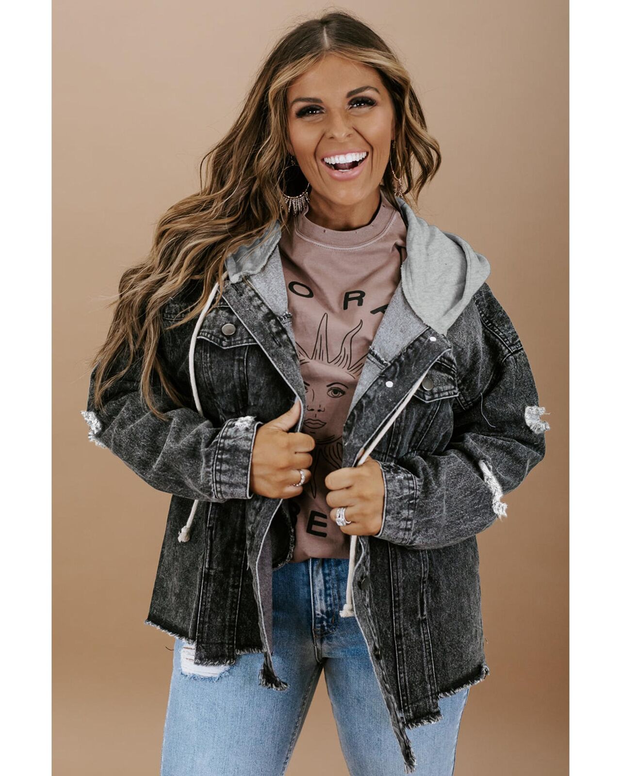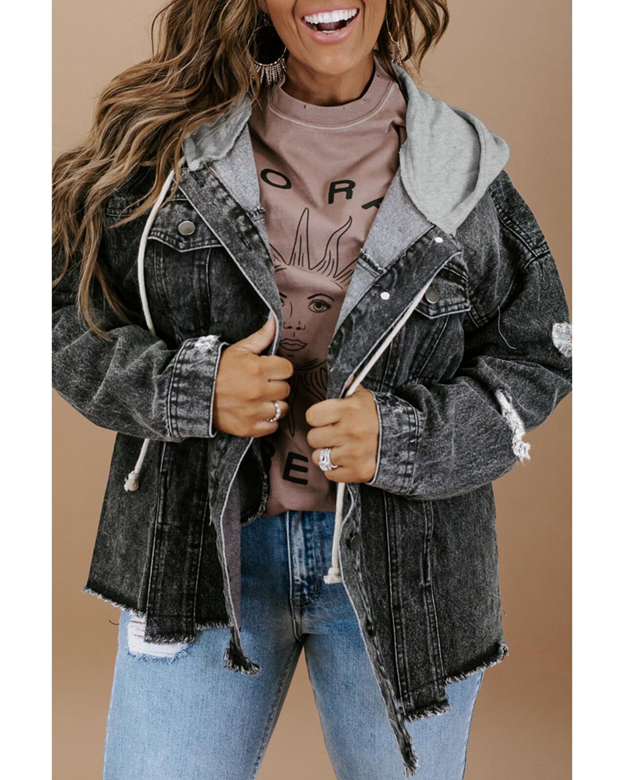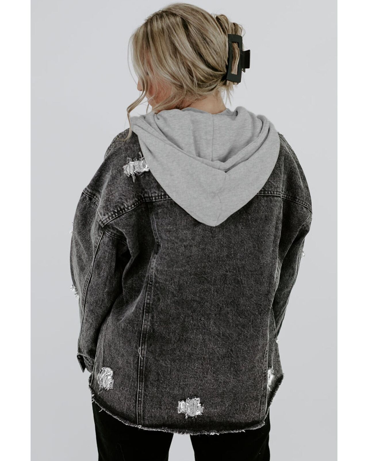 Black Drawstring Hooded Frayed Denim Jacket - M