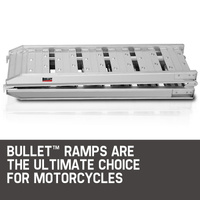 Watch out for copies of this awesome product! The Bullet 1.8m Ramp weighs only 7kg thanks to BULLET's patented Ultra-Light Design. With the rider in mind, BULLET have delivered a ramp solely intended for single user loading with elevated side rails ensuring that your tires stay on the ramp. Moving your motorcycle from place to place has never been so easy. Load it up and down all by yourself!