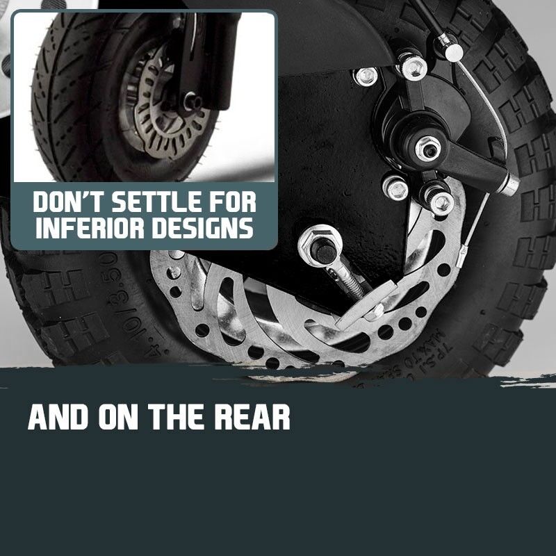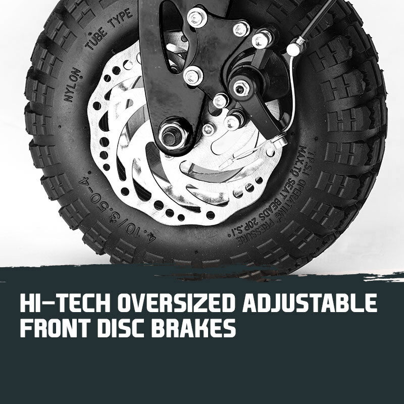 Of course, our boffins paid equal attention to the handling⇁ a high-tensile yet lightweight steel frame houses tough polished steel shocks, massive disc brakes and oversized knobby 10-inch tyres. For those that like to tinker with their toys, youll love how easy it is to tweak the shocks and brakes to your riding style.