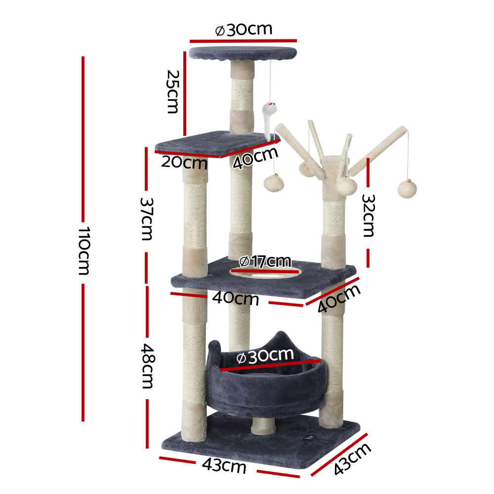 Our cat tree will let your feline friend play out its natural instinctive behaviour. It features a multi-level design with play cubicles, hanging toys, activity balls, sisal posts, and much more. This cat tree offers unlimited opportunities to provide your pets with fun-filled moments and keep them healthy. It also has comfortable velvet upholstered surfaces, ideal for napping after a long playtime. Furthermore, the sisal-wrapped poles are ideal for your pets to scratch and claw, keeping their claws healthy and distracting them from scratching the furniture. Crafted from fir wood with sisal posts, our cat tree is both pet and eco-friendly.