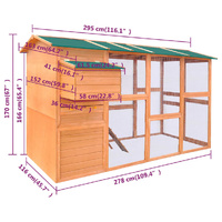 This spacious wooden chicken coop is a perfect choice for feeding your chickens and keeping them comfortable. In addition to a free-running range with an open bottom, there are sheltered resting areas and a nest box. The roof of the nest box can be opened for the collection of eggs. The iron wire mesh allows fresh air in. The upper floor can be accessed via two non-slip ramps. The upper portion has a removable tray for easy cleaning. The doors are lockable from the outside with the latches. Made of high-quality pinewood, the hutch is durable. The green waterproof fabric on the roofs keeps rain away, creating warm, comfortable resting areas inside the hen house. Input format
