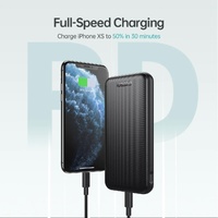 This portable Power Bank comes with USB-C power delivery input and output, 18W max output enables it to quick charge your iPhone from 0% to 50% in 30 minutes without damaging the battery as well as fully recharge the power bank in just 3.5 hours. (Note: The power bank cannot charge your device during the recharging process.)