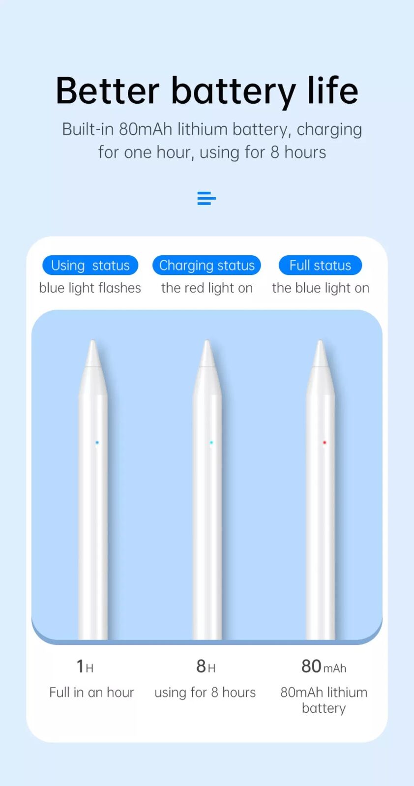 The fourth generation of anti-mistouch iPad stylus pen. Prevention of accidental touches smoother writing the same anti- inadvertent touch function with Apple Pencil. Tilt test in IOS system. Dynamic Switching between stroke 80 and 50. The width of the stroke can be adjusted according to the inclination. 11.2ms ultra-low lag. Same sensitivity as Apple Pencil, imperceptible lag, incredibly easy to use and ready the inspiration strikes. Say goodbye to plug charge with touch.