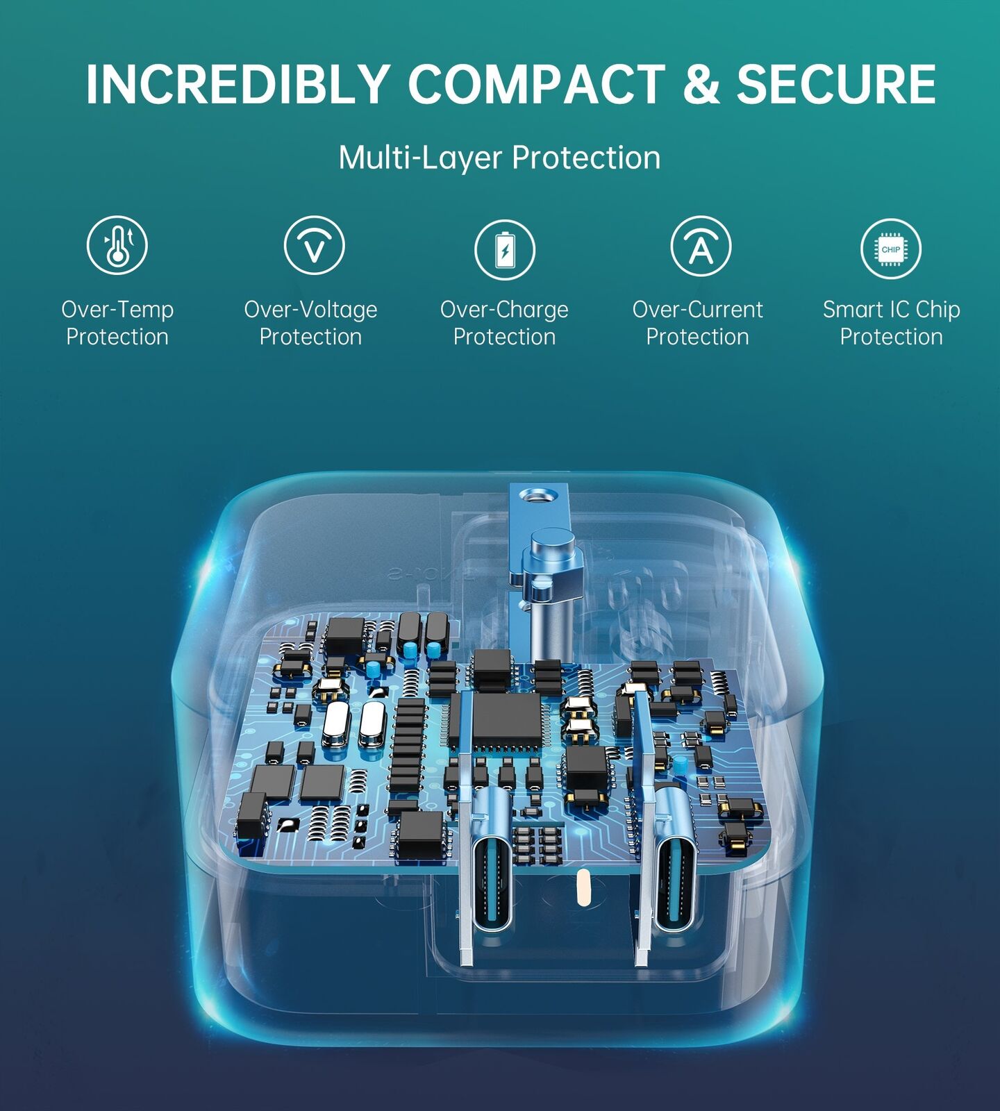 With a foldable plug and dual type c port in one charger plug, it's sleek and small enough to easily slip into your purse or pocket, making it ideal to travel with. With intelligent chip inside, the 40W Dual USB C wall adapter offers multiple safeguards against excessive current, overheating, overcharging, and more