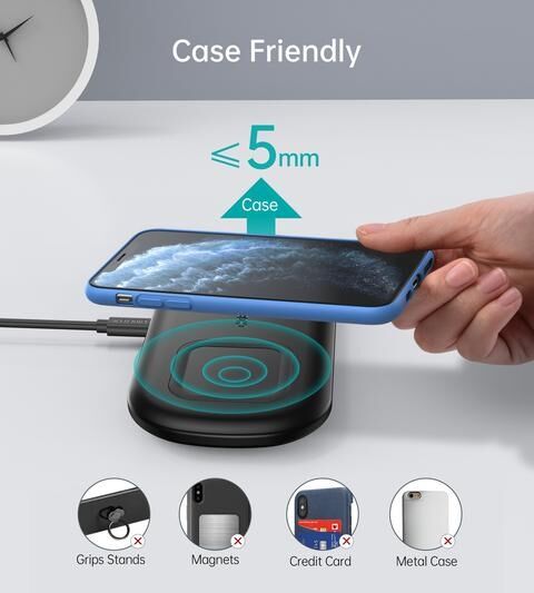 The LED indicator allows you to easily check the charging status of your device and is designed to be gentle enough that it won't disturb your sleep. Charges through most lightweight plastic cases - up to 6mm. Most mobile phone cases can be charged wirelessly without the need to disassemble them, just remove the magnetic or metal accessories from the phone/phone case.